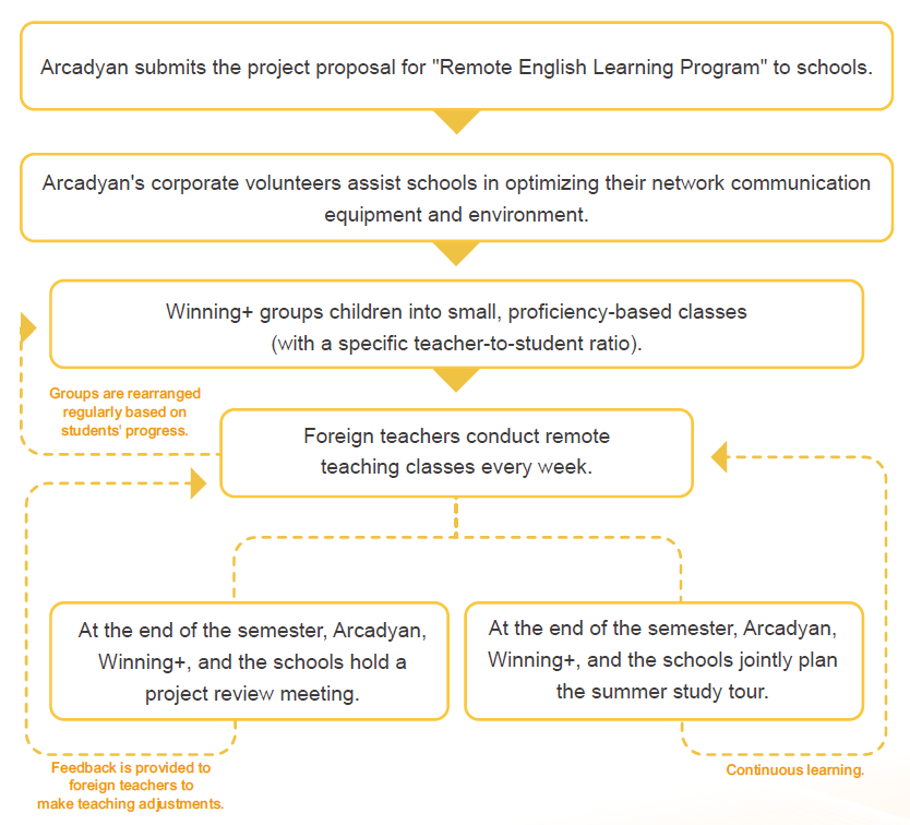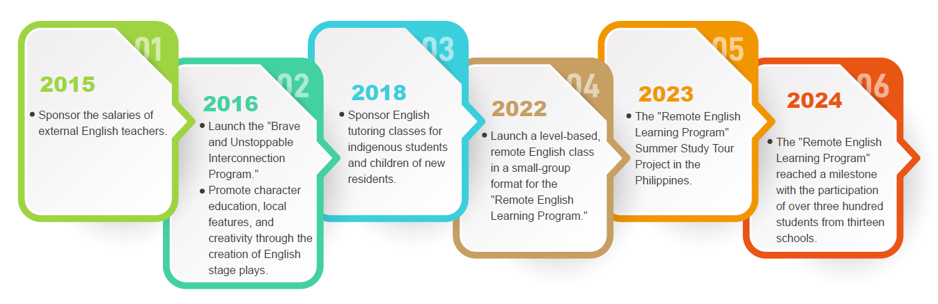 To achieve educational equity, Arcadyan launched the Remote English Learning Program in 2022. Initiated by the Social Care Committee, the program partners with Winning English School to provide systematic English resources through their digital platform. The small-group, levelbased format is designed to enhance students' skills and motivation, and in 2024, the program expanded to 13 schools, assisting 186 students for 700 learning hours with an investment of over NT$420,000. According to teacher feedback, the program not only supplements school resources but also leads to significant student progress and high participation.