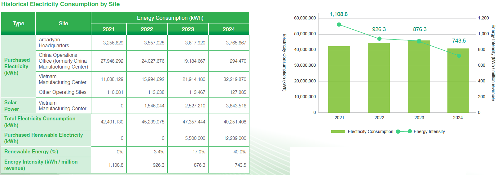 The primary energy consumption at Arcadyan's operational sites comes from purchased electricity. To support the Group's net-zero emissions target, strengthening energy management has become a top priority in its decarbonization strategy. In order to systemically monitor and optimize energy use, Arcadyan has fully implemented the ISO 50001 Energy Management System across its headquarters and manufacturing center. Through standardized processes and real-time energy monitoring mechanisms, the company conducts in-depth analysis of energy hotspots within its facilities. Based on the analysis results, targeted strategies for electricity management and demand control are executed to enhance energy efficiency and achieve the combined benefits of energy conservation, cost reduction, and carbon emission reduction. In 2024, Arcadyan's energy intensity reached 743.5 kWh per million in revenue, representing a 15.2% reduction compared to 2023. This exceeded the annual target of a 1% reduction in energy intensity, demonstrating Arcadyan's firm commitment and tangible progress in improving energy efficiency.