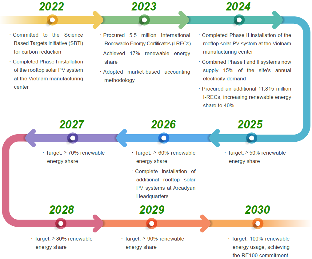 Arcadyan has implemented energy intensity tracking to continuously monitor energy and carbon performance per unit of operational output. This ensures that, even as the company expands its operations, it can steadily reduce carbon emissions per unit and advance in parallel toward both sustainable growth and climate responsibility.