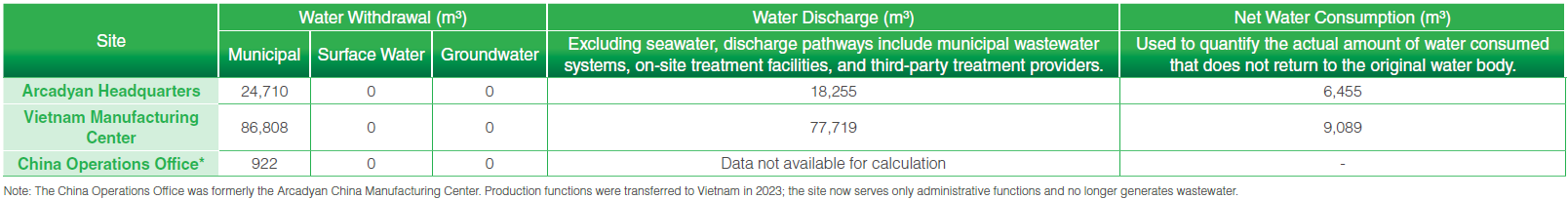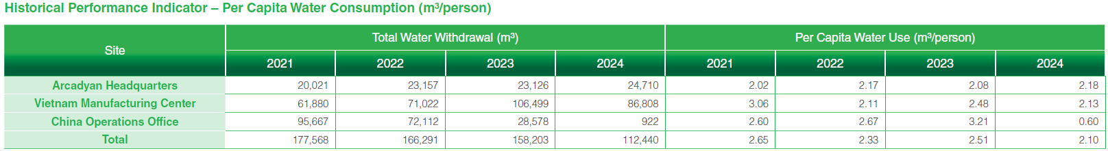 Arcadyan installs appropriate water treatment and management facilities based on the specific water usage patterns and wastewater characteristics at each operating site. These systems ensure that discharged water complies with regulatory standards while minimizing potential environmental impact. At headquarters, the kitchen is equipped with a grease separation system, effectively reducing the discharge of oily waste into the sewage system and the environment. All wastewater and discharge water across sites consistently meet or exceed local environmental standards. Ongoing water quality monitoring and risk management mechanisms are in place to further strengthen environmental protection efforts. Following the relocation of manufacturing capacity from China to Vietnam, the former China manufacturing center, now operating solely as the logistics and administrative office, no longer engages in production activities. Daily water consumption is limited to basic domestic use, resulting in a significant reduction in both water intake and discharge volumes, and thereby lowering environmental impact.