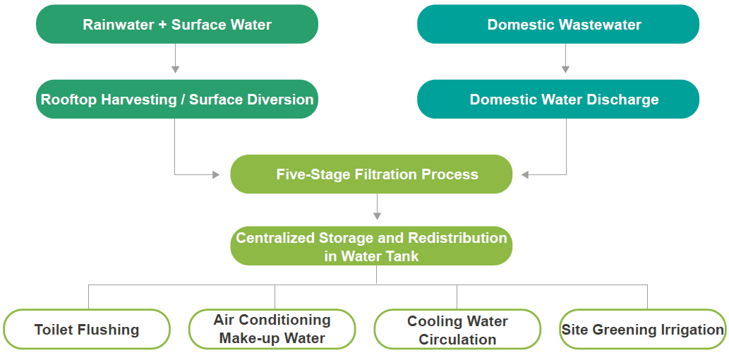 Since its establishment in 2021, the Vietnam Manufacturing Center has been equipped with a rainwater harvesting system that collects rainwater and surface runoff through rooftop and ground catchment systems. After initial filtration, the water is reused for toilet flushing and landscape irrigation, effectively reducing the use of tap water. At the end of 2023, the site further implemented a domestic wastewater recycling system. Using a five-stage filtration process, the system treats and reuses both rainwater and domestic sewage collected in a central storage tank, and redistributes the water for various uses including toilet flushing, air conditioning makeup water, cooling circulation, and green area irrigation. In 2024, the rainwater and wastewater recycling systems together reclaimed 77,719 cubic meters of water, accounting for 50% of the site's total water usage. This significantly increased the proportion of recycled water and delivered substantial water-saving results. Arcadyan will continue to evaluate water usage patterns across its operations, gradually expand recycling system capacity, and optimize water management strategies to achieve more efficient and environmentally responsible water use.