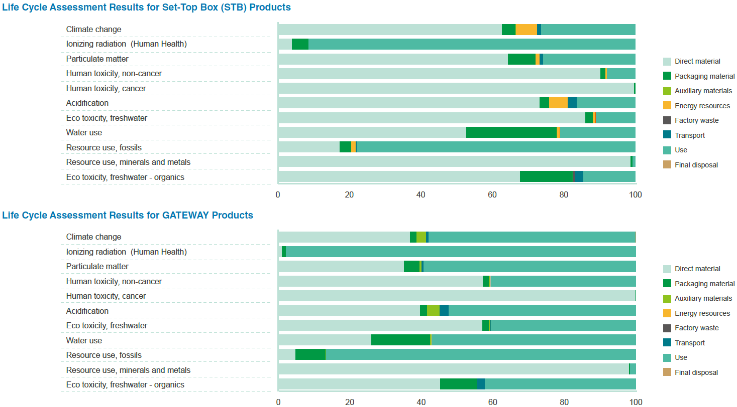 Arcadyan conducts LCA in accordance with ISO 14040 and ISO 14044 standards, using specialized software to assess environmental impacts and carbon footprints. The assessment framework is aligned with the EU's Product Environmental Footprint (PEF) methodology and the Product Category Rules (PCR) for IT equipment, which define five key life cycle stages: raw material acquisition, manufacturing, distribution, use, and end-of-life treatment. Evaluations cover 27 environmental impact categories, including climate change, human toxicity, freshwater ecotoxicity, mineral resource depletion, and fossil resource depletion. In 2024, products undergoing LCA at the request of customers accounted for approximately 10% of total shipments— highlighting Arcadyan's commitment to transparency in environmental information and the advancement of sustainable product design.