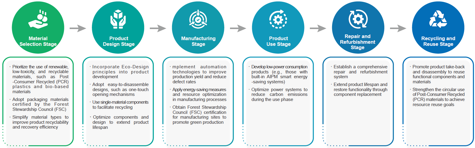 In response to global challenges such as climate change and resource depletion, Arcadyan adopts Product Life Cycle Management (PLCM) as a core strategy. The company integrates environmental considerations into every stage of the “Cradle to Cradle” approach—including material selection, product design, manufacturing, usage, repair and refurbishment, and end-of-life recycling. Through this systematized and integrated sustainable design process, Arcadyan implements carbon reduction, energy efficiency, and resource circulation strategies to enhance product recyclability and environmental value.