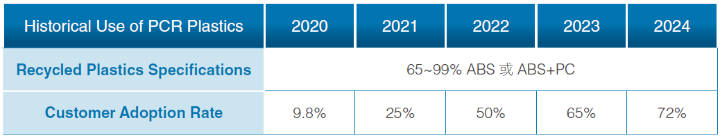 Arcadyan actively promotes the circular use of plastic materials by developing high-recyclability plastic compounds and increasing the proportion of recycled content in its products. Since 2015, Arcadyan has incorporated 65% to 99% post-consumer recycled (PCR) plastic into product plastic components. For materials such as ABS or ABS+PC, a clip-fit structure is used in place of traditional screw-fastening methods to reduce screw usage, improve structural strength, and facilitate recyclability. In 2024, approximately 72% of Arcadyan's shipped products included recycled plastics, achieving its target of exceeding 70%. This reflects Arcadyan's strong commitment to advancing material circularity. The company will continue to enhance the development and application of recycled materials, aiming to reach a 75% adoption rate in customer products by 2025, thereby deepening the implementation of circular economy practices.