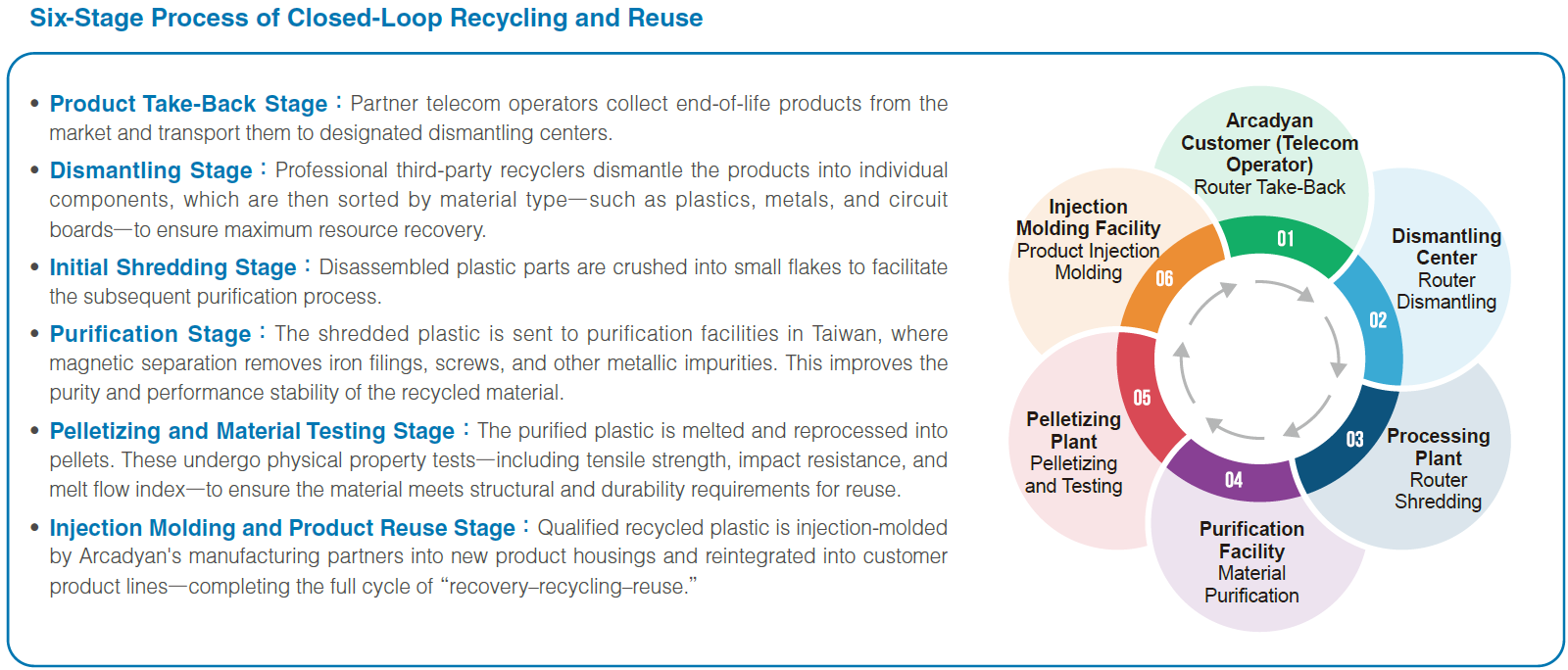 Arcadyan will continue to strengthen partnerships with customers, recyclers, dismantlers, and suppliers to expand the types and applications of recovered materials. Through the “recover–reprocess–reuse” model, the company supports green supply chain transformation and demonstrates its commitment to circular resource use and greenhouse gas reduction.