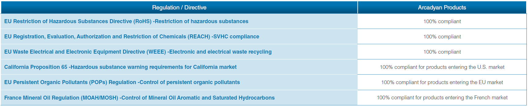 Arcadyan ensures that all products comply with international environmental regulations and customer-specific requirements by fully implementing hazardous substance management and environmentally friendly design principles. As of 2024, the applicable major regulations and product compliance statuses are summarized in the following table. To maintain a competitive edge in global environmental compliance, Arcadyan continues to strengthen realtime regulatory tracking and conformity control through its internal material management systems and close collaboration with the supply chain. These efforts also actively support customers in advancing sustainable supply chain management goals.