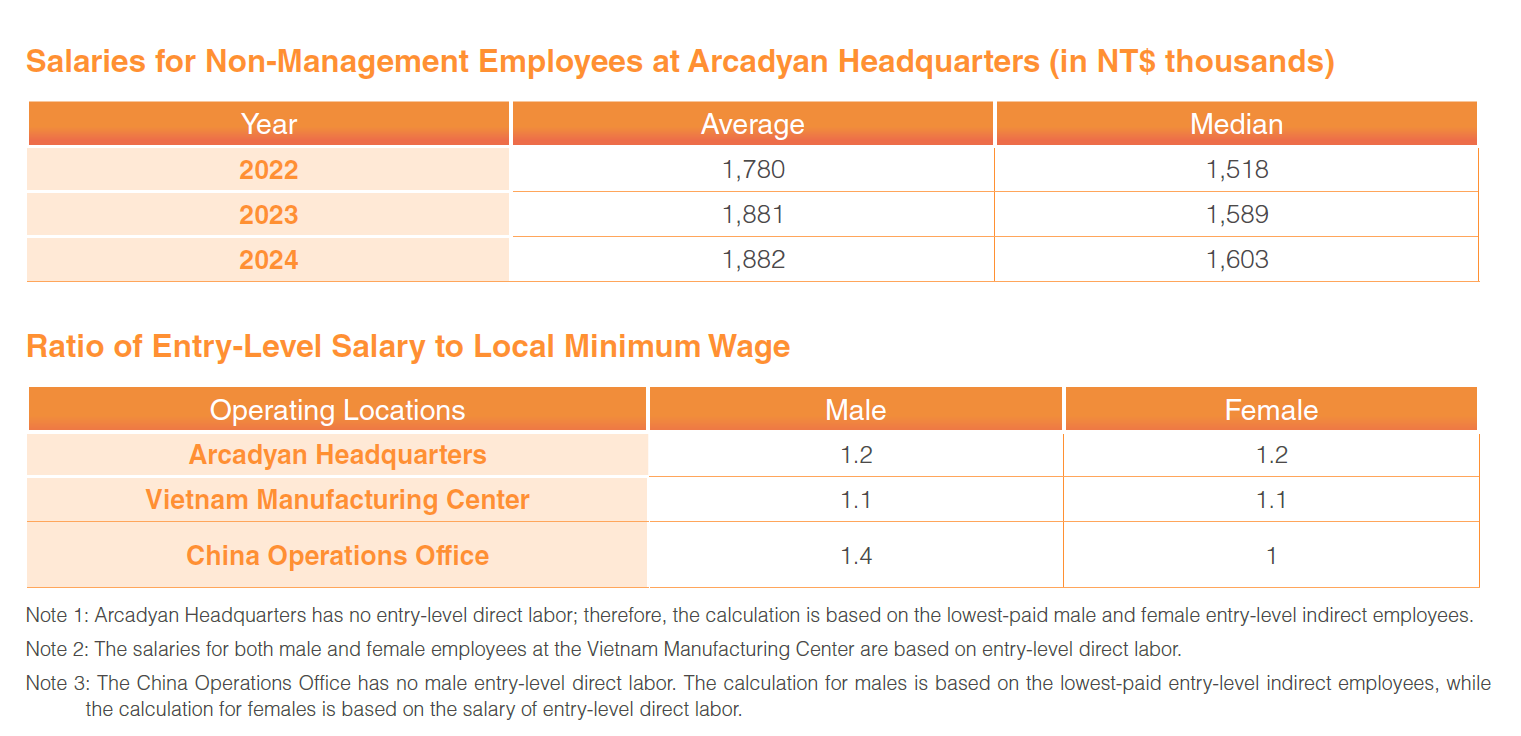 In continuous efforts to optimize our compensation policies, Arcadyan references the living wage definition from international organizations such as the Global Living Wage Coalition (GLWC) and the Fair Labour Association (FLA). We apply their principle—that a living wage should be sufficient to cover basic living expenses, including food, housing, healthcare, education, and savings—and align with UN Sustainable Development Goal "SDG 8: Decent Work and Economic Growth." Accordingly, we regularly review and adjust our compensation structure based on local minimum wage, cost of living, and inflation rates. To ensure our compensation system meets local economic conditions and employees' basic needs, we have also established the "Arcadyan Technology Living Wage Commitment."