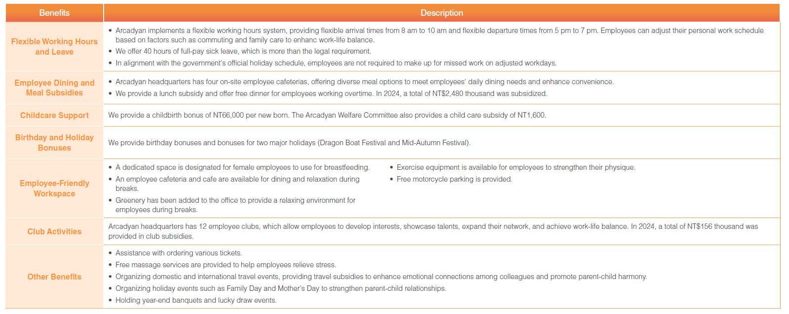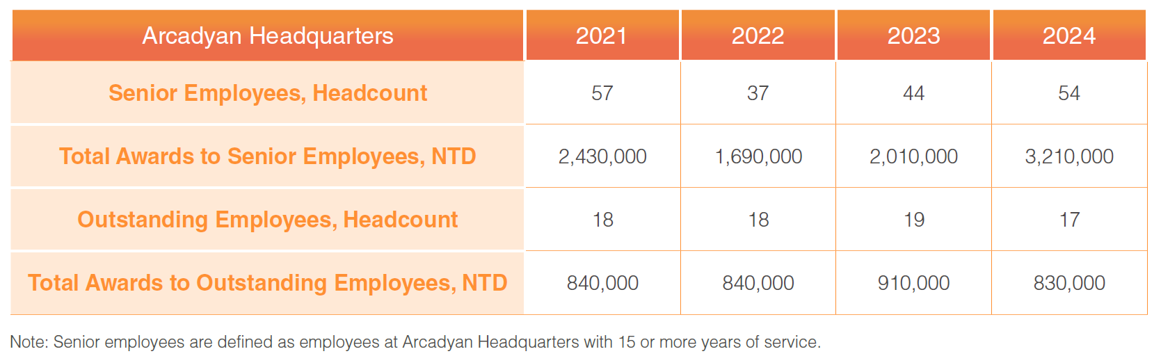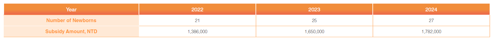 Arcadyan headquarters established a childbirth bonus system starting in 2011, providing eligible employees with an NT$66,000 subsidy for each newborn. As of 2024, a total of 364 newborns have benefited from this program, with cumulative bonuses reaching