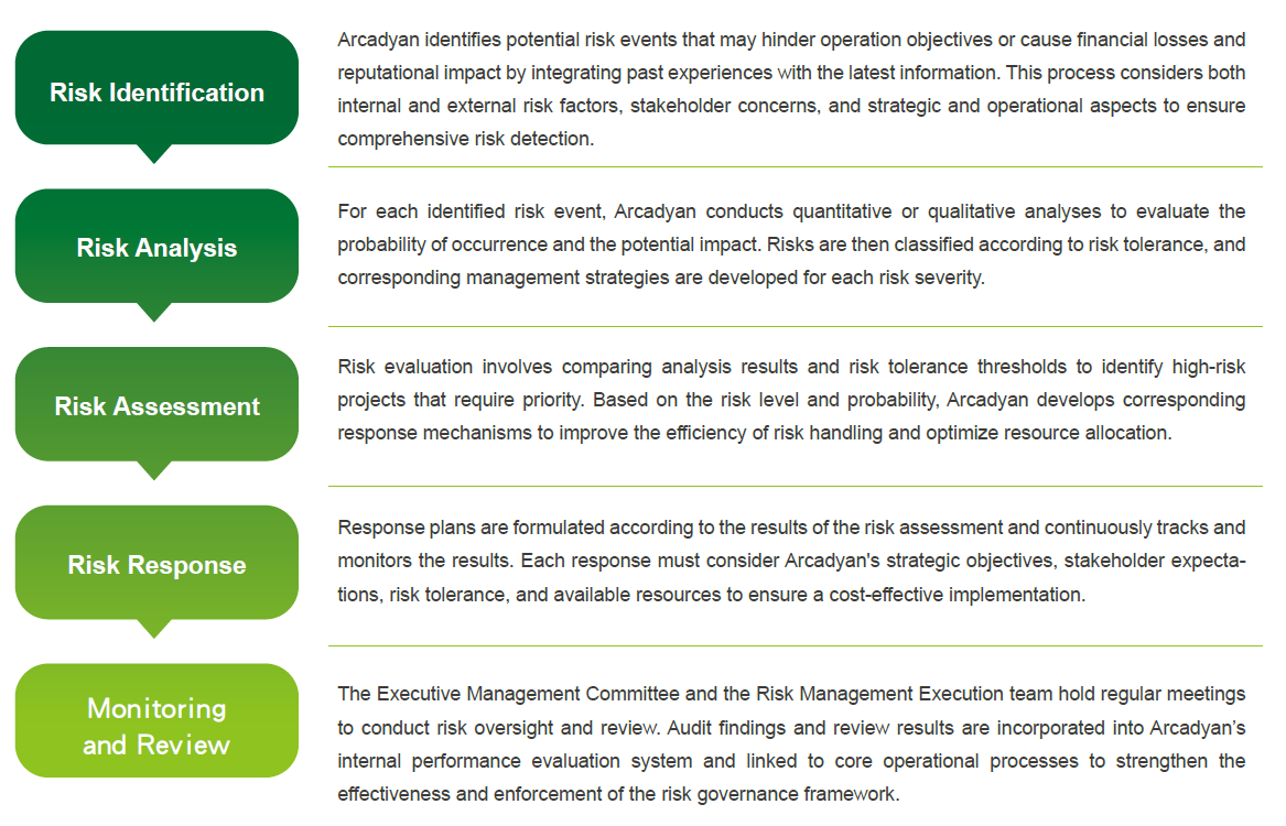 Arcadyan established "Operational Risk Management Procedure" that encompasses five key elements: Risk Identification, Risk Analysis, Risk Assessment, Risk Response, and Monitoring & Review. These serve as the core framework of Arcadyan's risk management system. Through this procedure, Arcadyan systematically identifies and assesses potential operational risks, encompassing environmental, economic, corporate governance, and social dimensions, across its global operational sites and subsidiaries.
