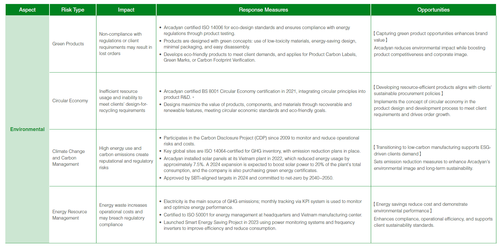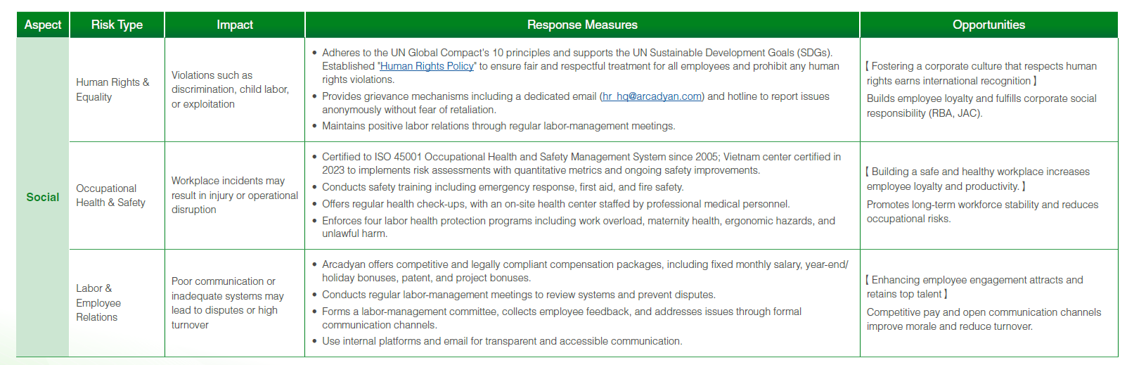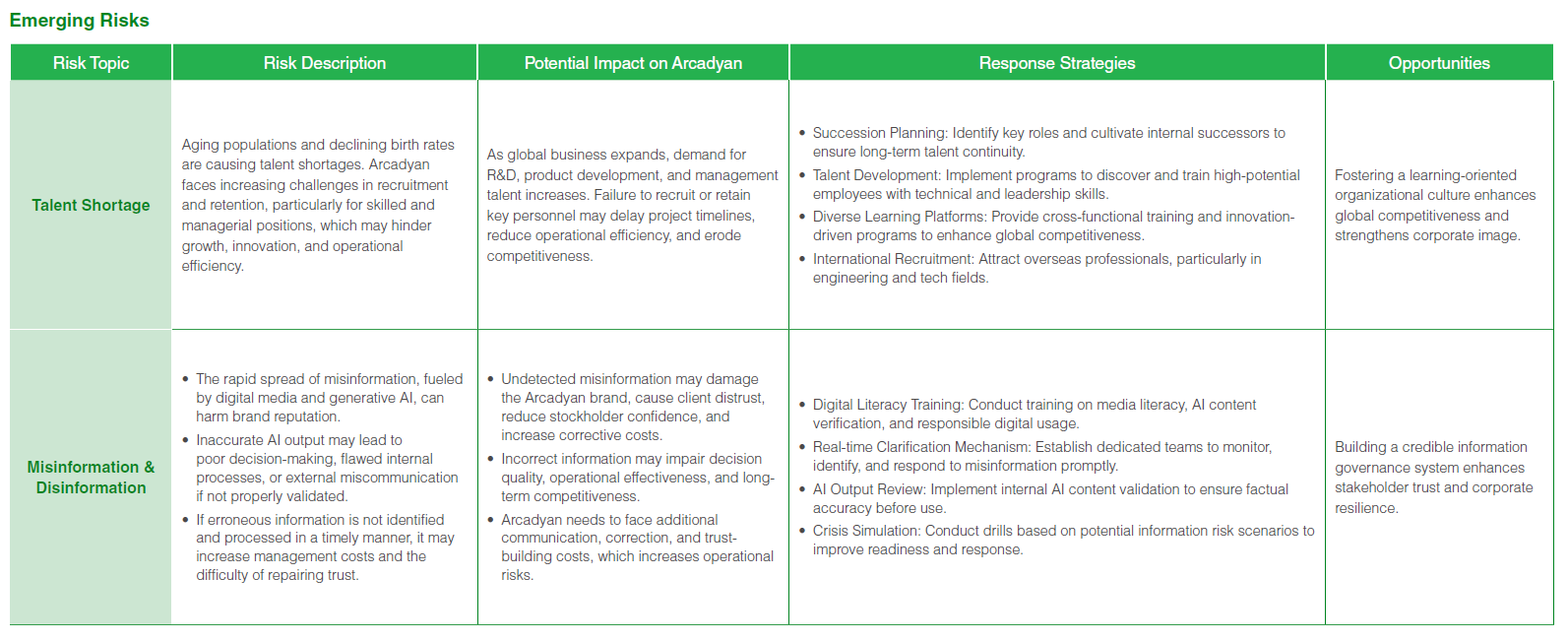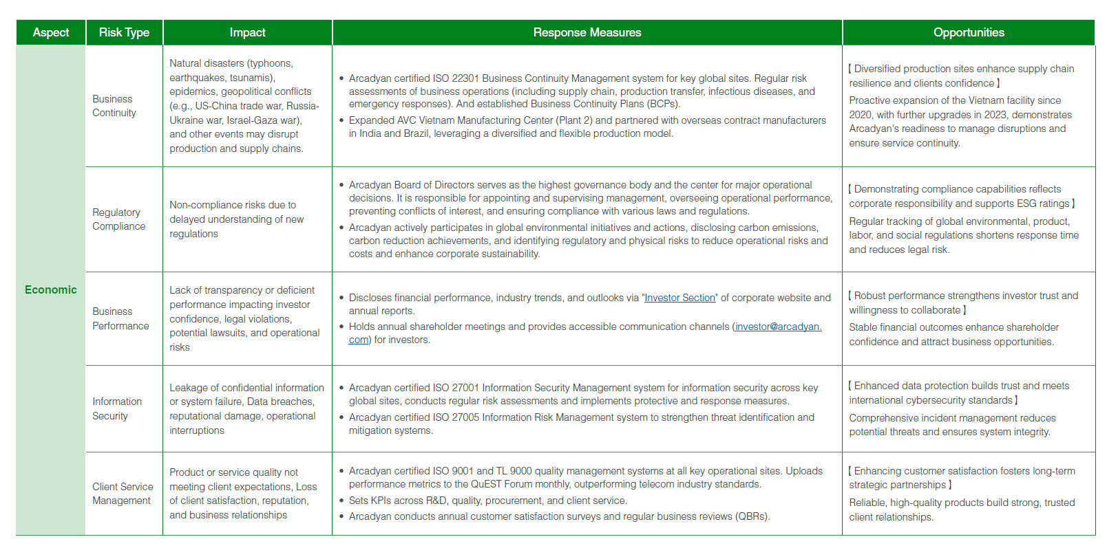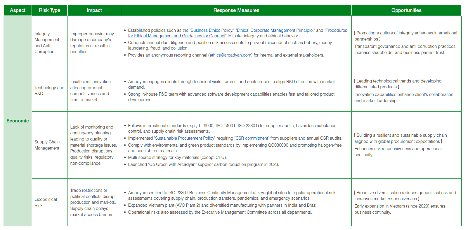 Through a systematic risk identification and assessment mechanism, Arcadyan conducts a comprehensive review of potential risks associated with its operations. In 2024, a total of twentyseven risk items were identified, covering economic, environmental, and social aspects. Following risk analysis and classification, Arcadyan prioritized those risks with the highest potential impact, narrowing its focus to nine economic risks, four environmental risks, and 3 social risks. For each of these critical risks, Arcadyan developed management strategies and response measures, while also assessing their potential for transformation into opportunities, strengthening its resilience and adaptability in an increasingly dynamic and uncertain global environment.