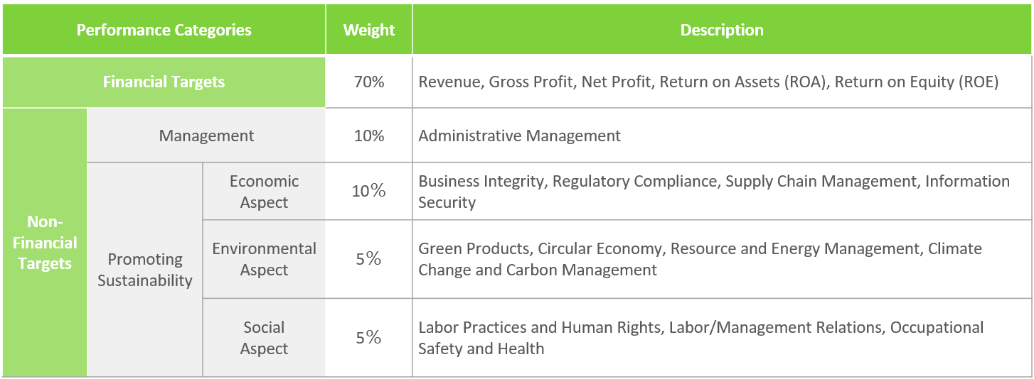 Compensation for senior executives, such as the Chairman, General Manager, and Deputy General Manager, is determined in accordance with Arcadyan's compensation policy, considering individual's job level, professional competence, educational background, and responsibilities, and are further linked to performance evaluations based on both financial and nonfinancial indicators. The compensation structure consists of 70% financial indicators—such as individual performance achievement and contributions to operation performance; and 30% nonfinancial indicators—such as project leadership, compliance performance, and internal control effectiveness. This ensures that the compensation structure is aligned with Arcadyan's long-term sustainability goals. Arcadyan is committed to regularly reviewing