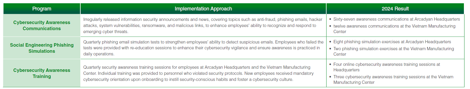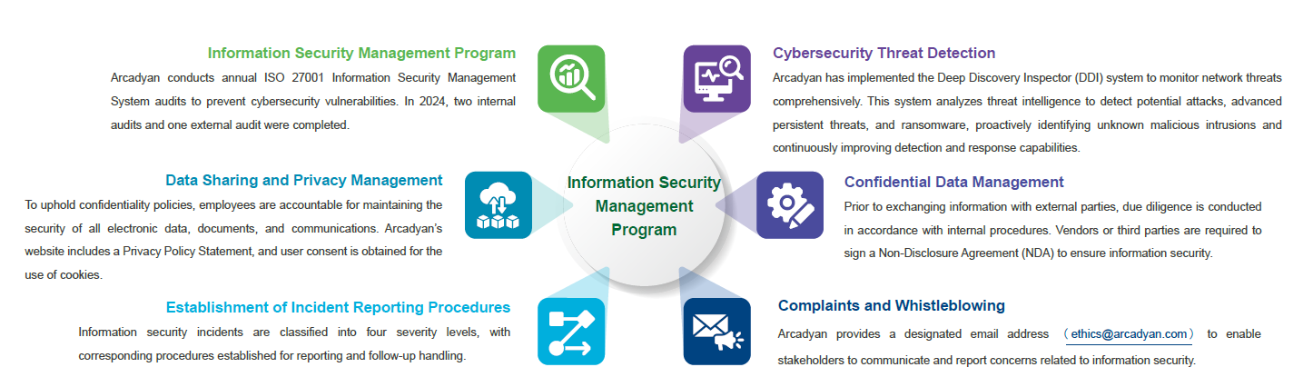 - Information Security and Data Protection: Employees must properly manage electronic files, printed documents, and communication records to prevent unauthorized access, leakage, or misuse. Through the implementation of information security policies, audit mechanisms, and training programs, Arcadyan strengthens employee awareness and actions to protect Arcadyan's and stakeholders' information assets.