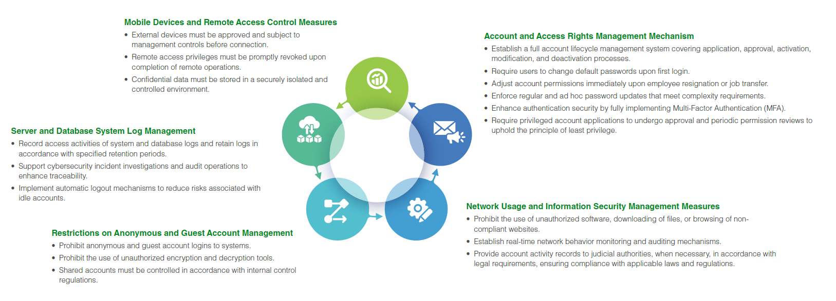 To comprehensively safeguard Arcadyan's and clients' information assets and prevent the risk of unauthorized third-party access or data leakage, Arcadyan has established a multi-layered information security control mechanism. This mechanism extends from core account management to mobile device and network usage, reinforcing access control and minimizing the risk of unauthorized access. The key control measures are as follows:
